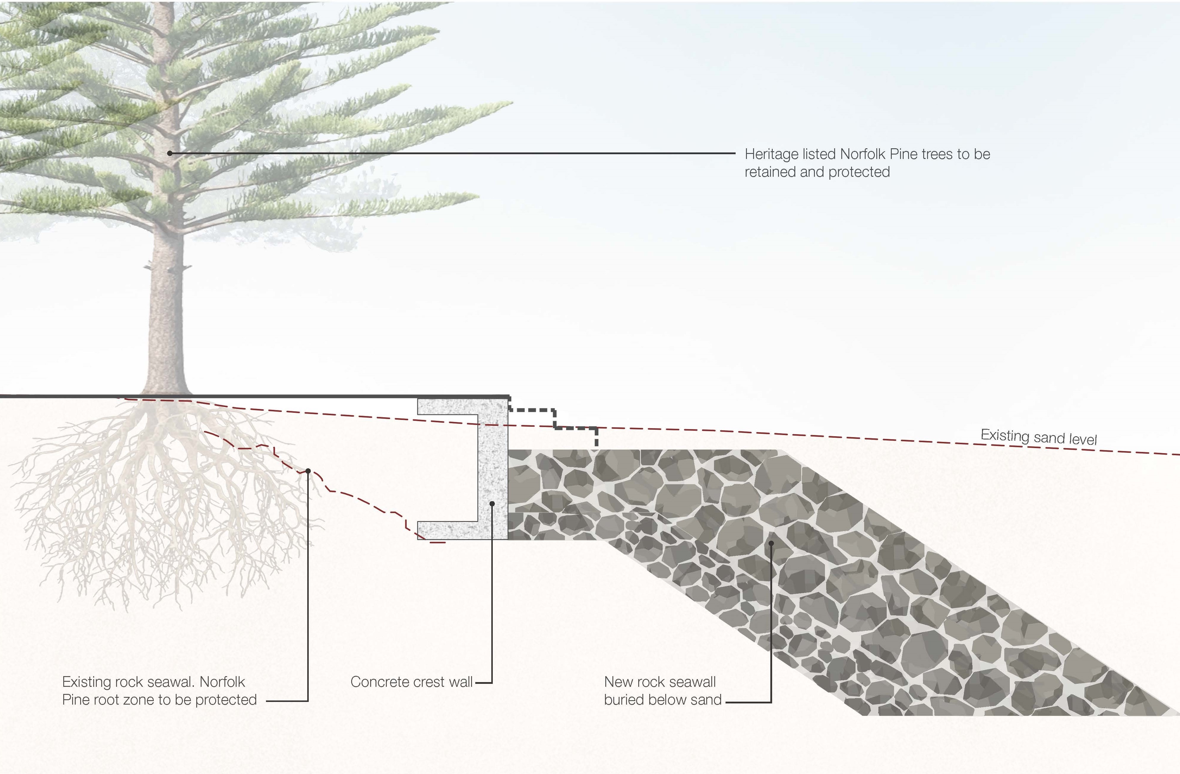 The new seawall has been carefully designed around the protected and iconic Norfolk Pines on the Burleigh Heads foreshore. A tree protection zone has been established, and specialist arborists will monitor the seawall works.