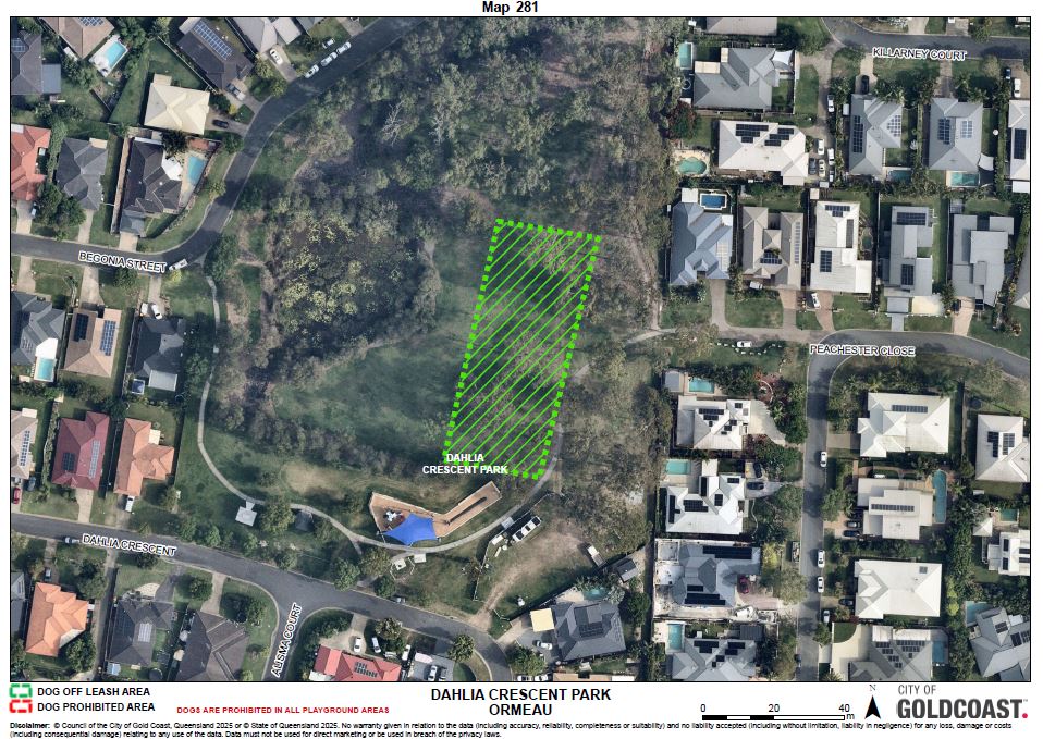 The dog off leash exercise area is limited within the area indicated by the green dotted line on schedule 2, map 281.